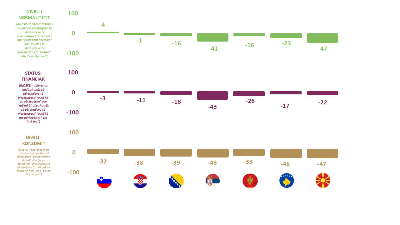 - Sllovenia: Shifrat më të qëndrueshme regjistrohen në Slloveni, ku të tre indeksët – ai i Normalitetit (4), i Statusit Financiar (-3) dhe ai i Konsumit (-32) – janë ndër më të lartët në rajon. Shqetësimi për inflacionin (51% shumë të shqetësuar) dhe për situatën politike (30% shumë të shqetësuar) mbeten ndër nivelet më të ulëta në rajon. Gjithashtu, nuk u vërejtën lëvizje të ndjeshme në krahasim me tremujorin e tretë (T3).