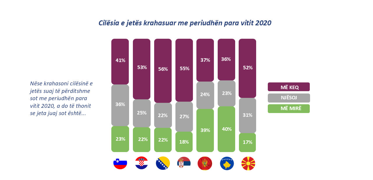 Ekziston një pajtim i gjerë në rajon se cilësia e jetës është përkeqësuar në krahasim me periudhën para vitit 2020. Më pesimistët rezultojnë banorët në Bosnjë e Hercegovinë (56%) dhe Serbi (55%), të ndjekur nga Kroacia (53%) dhe Maqedonia e Veriut (52%). Kjo përqindje është paksa më e ulët, por mbetet ende e lartë në Slloveni (41%). Numri më i vogël i atyre që e shohin jetën e tyre më keq se para vitit 2020 regjistrohet në Malin e Zi dhe Kosovë – rreth një e treta e popullsisë.