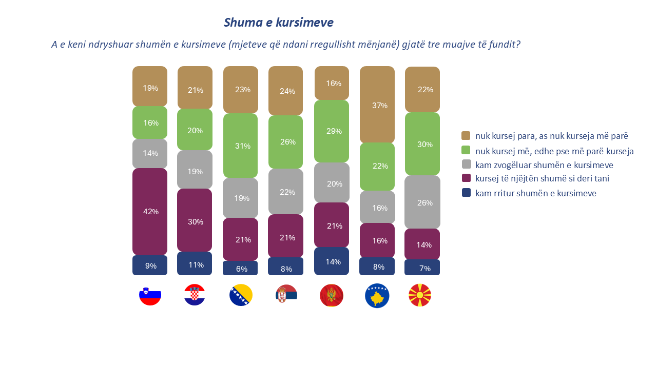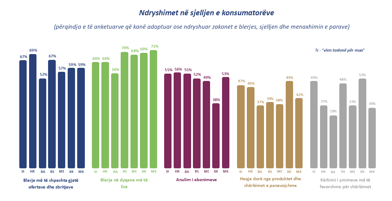 - Optimizimi i shërbimeve dhe heqja dorë nga gjërat jo-esenciale: Rreth gjysma e konsumatorëve në Kosovë (52%), Slloveni (49%) dhe Serbi (48%) po kërkojnë në mënyrë aktive ofrues më të lirë shërbimesh. Një përqindje e ngjashme e qytetarëve në Slloveni, Kosovë dhe Kroaci (46–49%) po heqin dorë me vetëdije nga produktet që nuk janë të domosdoshme.