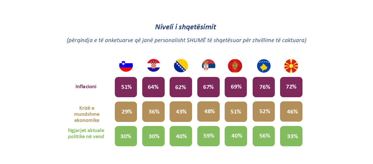 Burimi kryesor i shqetësimit në të gjithë rajonin mbeten vështirësitë financiare, kryesisht për shkak të inflacionit dhe rritjes së kostos së jetesës. Shumica e njerëzve ndjejnë se situata e tyre financiare ka mbetur e pandryshuar ose është përkeqësuar. Nivelet më të larta të shqetësimit lidhur me inflacionin regjistrohen në Kosovë (76%) dhe në Maqedoninë e Veriut (72%), ku përqindja e atyre që janë tejet të shqetësuar është rritur krahasuar me tremujorin paraprak.